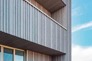 Die Architekten legten großen Wert auf natürliche Materialien, einfache und edle Details sowie die richtige konstruktive Verarbeitung für einen qualitätsvollen und langlebigen Bau. Der Mix aus Stahlbetonbauweise, konstruktivem Holzbau sowie einer Fassadengestaltung aus Holz machen das Objekt zum urbanen Blickfang mit organischer Anmutung.