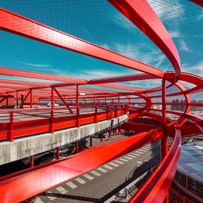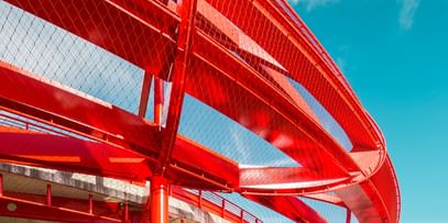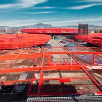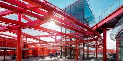 Die markante rote Stahlkonstruktion auf dem Dach verleiht dem Gebäude seinen unverkennbaren Charakter. Damit das leuchtende rot lange erhalten bleibt wurde dabei auf die Korrosionsschutz-Anstriche Agropur Color und Agropox Phosphat von AvenariusAgro gesetzt.
