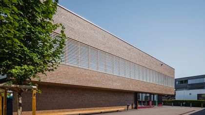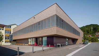 Auf diesem innovativen „Holzbau-Mutterboden“ ist auch die Gestaltung der neuen Schulsporthalle gewachsen. Das Gebäude wurde von der Gemeinde Wolfurt als Zubau für eine bereits bestehende unterirdische Ringerhalle errichtet. Im Verbund mit der benachbarten Hofsteig-Sporthalle verfügen die Schule und die Vereine nun über ein regionales Sportzentrum mit einem vielfältigen Raumangebot.