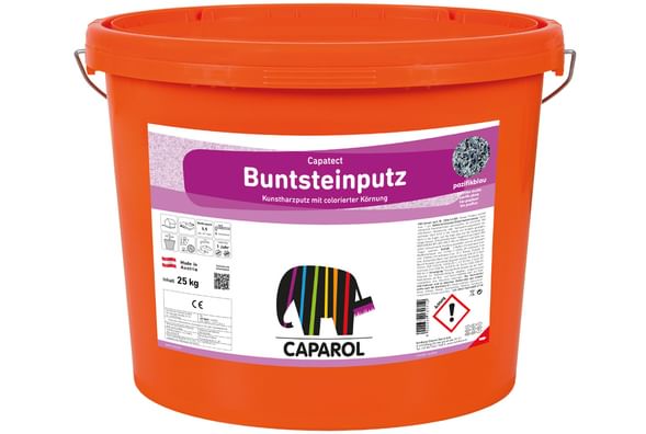 Capatect Buntsteinputz fein ist verarbeitungsfertig und wird lediglich aufgerührt. Bei warmer Witterung ist eine Konsistenzregulierung durch geringe Wasserzugabe möglich.