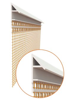 Kunststoffprofil für Anschlüsse von WDVS zu Attikaabdeckung mit verschweißten Gewebestreifen, gelochten Schenkel, Abzugkante für den bewährten Unterputz und Abschlussschenkel für die Endbeschichtung.