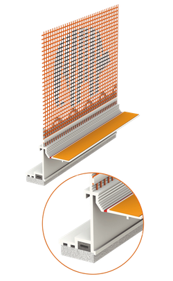 Nach ausreichender Trocknung der verklebten Dämmplatten kann in diesem Bereich das Glasgewebe der Anschlussleiste in die jeweils zum Einsatz kommende Armierungsmasse eingebettet werden. Der armierte Unterputz wird dabei am Abzugsteg der Leiste abgezogen. Auf 10 cm Gewebeüberlappung muss dabei sowohl in der Laibung, im Bereich Leistenstoß als auch in der Flächenarmierung geachtet werden. Um eine Rissbildung im Leistenstoßbereich zu verhindern muss das Gewebe bis an den Abzugsteg der Anschlussleiste herangeführt werden. Armierter Unterputz und Strukturputz können nur systembezogen ausgeführt werden.