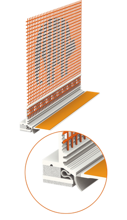 Kombiniertes, 10 mm schmales Kunststoffprofil mit dreidimensionaler Bewegungsaufnahme der Klasse III für schlagregensichere Anschlüsse von WDVS an Fenster- und Türrahmenkonstruktionen.