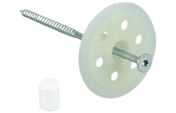 Der Capatect-Schraubdübel Holz besteht aus zwei Teilen: Dem Dübelteller mit kurzem Schaft aus Kunststoff und vormontierter, verzinkter Holzschraube. Der Dübelteller kann wahlweise auf der Dämmstoffoberfläche bündig, oder auch versenkt montiert werden.