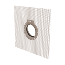 Kunststoff-Formteil mit integriertem Gummidichtring, kraftschlüssig aufgeklebtes Gewebe und Abzugskante für die Armierungsmasse. Für schlagregensichere Anschlüsse von Flächenbeschichtungen an Rohrdurchführungen.